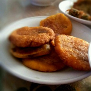 下锅油炸即可。实验了油煎和油炸两种方法,孩子说炸得好,于是南瓜炸糕诞生了。
