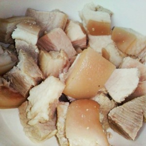 将肉捞出,切成方块儿,并把萝卜切块儿备用