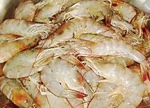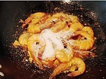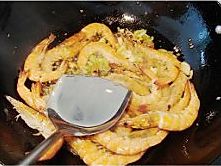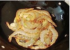 将处理好的虾倒入锅中,一面煎至发红后翻面继续煎至发红