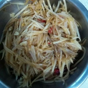 放土豆丝翻炒,放酱油,盐,快出锅时放醋,蒜片,翻炒几下,出锅