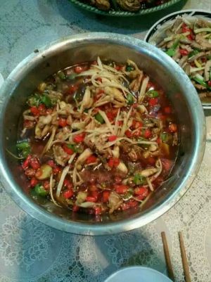 第四步,油汤熬制好后就把跑完油锅的田鸡放入油汤内煮,期间少许老抽调味调色。煮个五分钟左右就可以放二荆条,小米辣和仔姜丝了。再过个一分钟左右(保证辣椒和仔姜不要太生就行)然后放入适量盐味精鸡精。咸淡合适就可以起锅了。