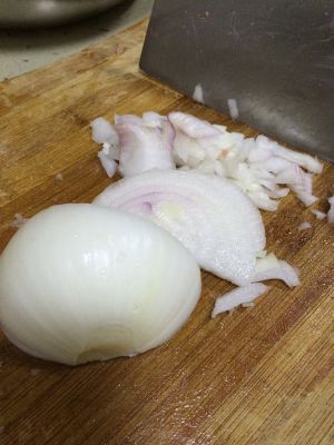 洋葱洗净,取半个切丁,放入装有肉末的盆里;