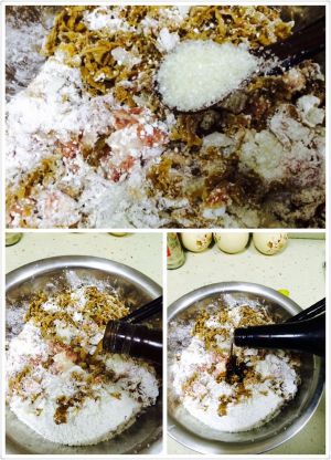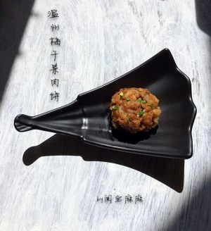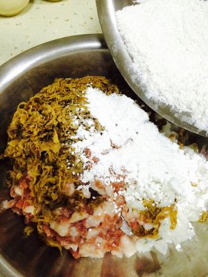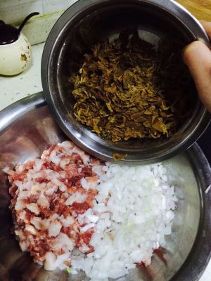 将梅干菜洗净、沥干,倒入装有肉末、洋葱的盆里;