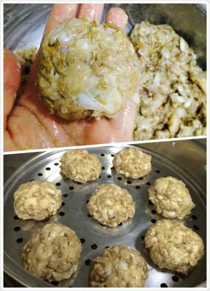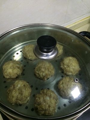 用手搓成圆球按扁放入蒸屉中,直至做完所有;
