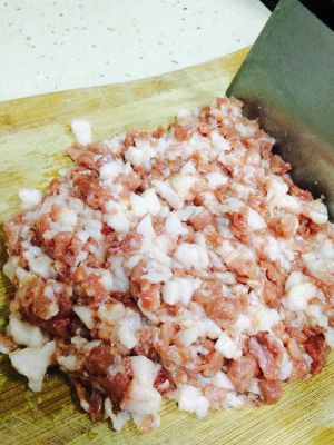 将五花肉剁成肉末,放在盆里备用;(不要剁太细哦!)