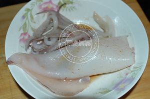 鲜鱿鱼撕去外皮,除内脏,洗干净.