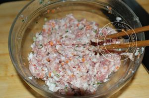 加入肉末里,加少量盐,料酒,一点点的糖,用筷子使劲朝一个方向搅上劲.