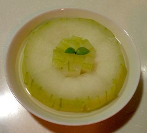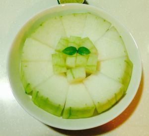冬瓜去皮、去瓤!我切12块,留两块切小块,填充中间!摆盘中,均匀撒入盐、白胡椒粉。