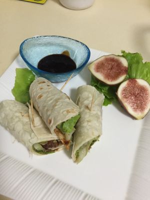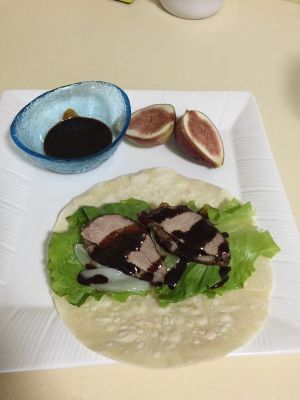 用薄饼加生菜大葱,切片的鸭肉浇上五果酱汁包起来
