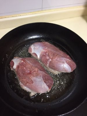 低温煎鸭皮,把鸭皮的油煎出来倒入碗里备用