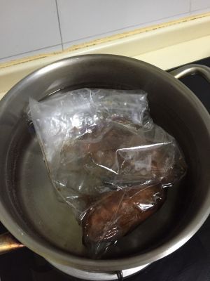 将少量熬制的五果酱汁倒入鸭肉中,倒入少量鸭油,放入65度的水中煮一个半小时