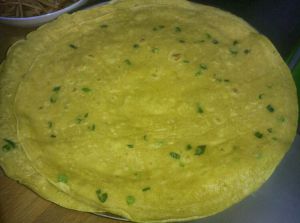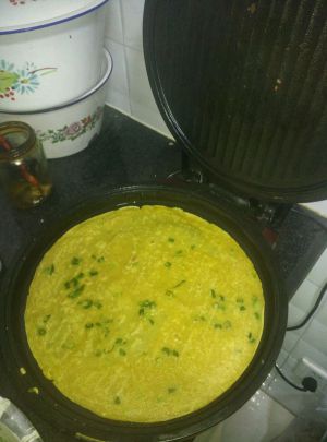 电饼档刷油,然后将面糊倒入,均匀平铺于锅底,双面加热。