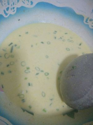 将面粉,鸡蛋葱花加入适量温水调和均匀成面糊,加入适量碱面和盐巴
