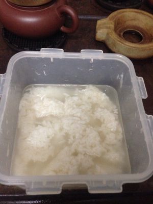 糯米泡两到三小时,上锅垫纱布蒸熟后连带纱布一起放进能滤水的容器,上水龙头冲,边冲边搅拌,让糯米饭变凉。