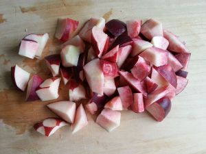 将桃子清洗干净后切小块、去核,不去皮。桃子皮的红色会让冰棒的颜色很漂亮