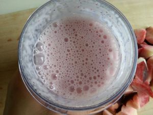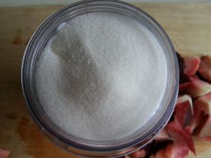 将酸奶桃子和细砂糖一起放入料理机理打碎。