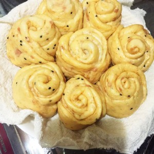 当当当。出锅啦,玫瑰花变成郁金香了。嘿嘿,因为放了酵母,最好不要趁热吃哦。第二天当早餐蛮好的