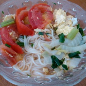 将煮好的白玉翡翠鸡蛋面汤盛出,浇在面条上面,吃之前搅拌一下,面条更入味。