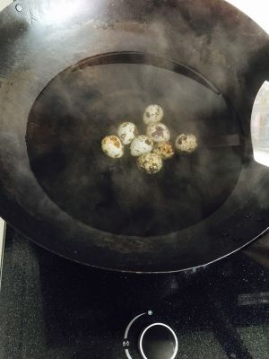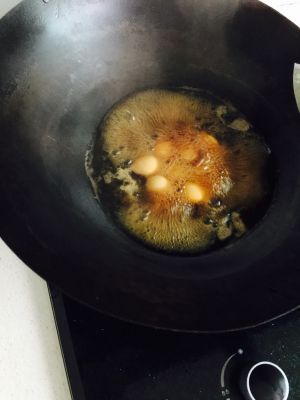 锅中放入啤酒老抽生抽白糖和鹌鹑蛋,用小火慢炖,汁剩一半后用大火收汁