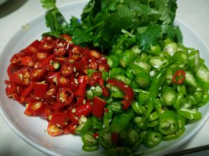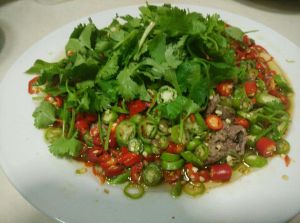第四,将切好的小青椒,小米辣,大蒜洒在盘中,与牛肉混合,在淋上蒸鱼豉油,藤椒油!