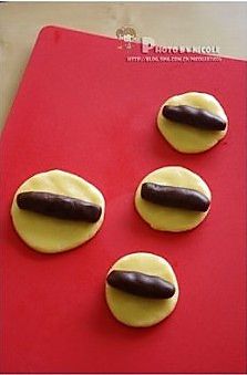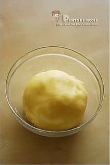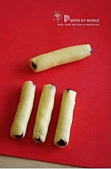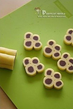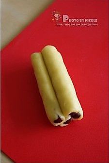 先从白面团中取出1/3,再将余下的2/3平均分成3份,分别揉成面团,可可面团也按此方法分量,白面团擀成小圆面片,可可面团分别揉搓成小长条,长度与擀好的面片相一致,并分别搭配;