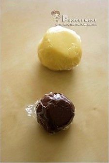 取出1/3面团,加入可可粉,剩余面团中加入玉米淀粉,分别揉匀,包上保鲜膜,放入冰箱冷藏松弛20分钟;