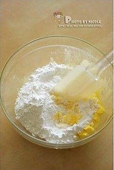 1. 无盐黄油室温下软化,加入糖粉,先用橡皮刮刀稍微搅拌;
