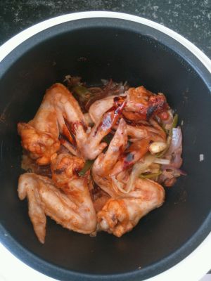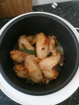 腌好的鸡翅置于上面,鸡翅上再撒些葱花,盖盖儿,按下煮饭键就好了