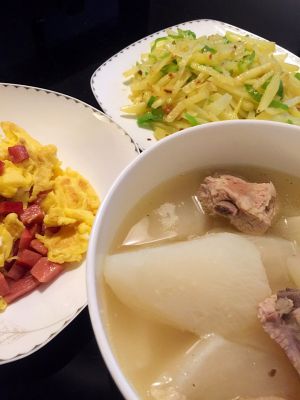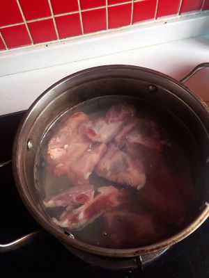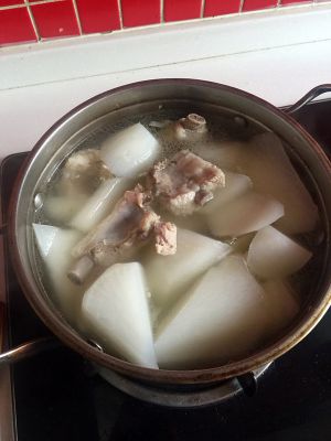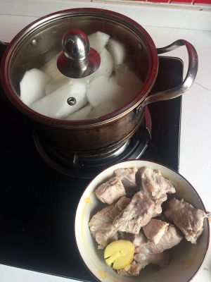 肉排、姜、料酒,放水,开始煮,煮开后转中小火,放萝卜煮开,再转小火。肉和萝卜煮到筷子可以扎进去,放盐和鸡精调味。