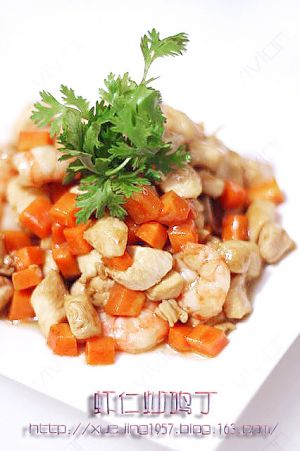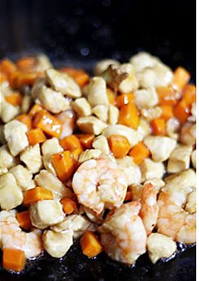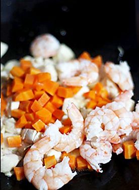 倒入飞过水的虾仁跟胡萝卜丁,翻炒一分钟。