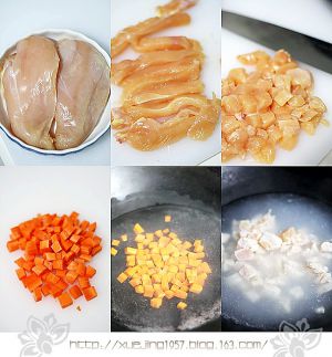 鸡胸肉改刀切成丁状,飞水至7成熟备用。胡萝卜改刀成丁状,飞水至断生捞出备用。