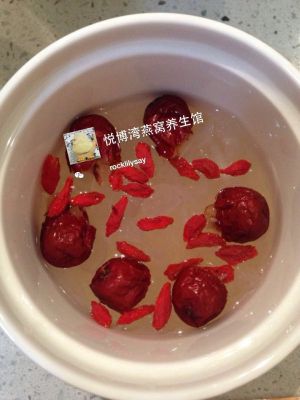 将红枣碎,枸杞放进放有燕窝的炖盅中,注意水刚刚漫过燕窝即可,继续泡发约1小时