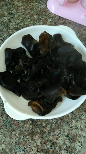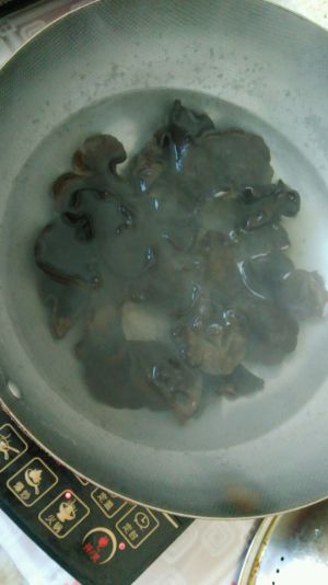 锅里烧开水。放少许盐。开了后把木耳烫熟。