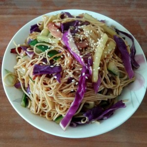 油锅烧热,下培根,放黑胡椒粉,煸一下,放虾米,然后放面条,倒点生抽,翻炒几下,放黄瓜和紫甘蓝,出锅前放点香油