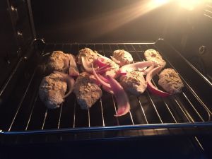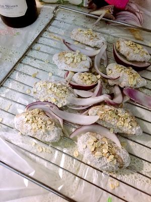 鸡翅裹一层粉,过一次水,再裹一层粉.两遍粉裹好后。散一些燕麦片.放置一些洋葱.