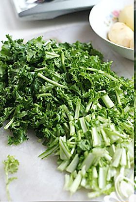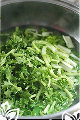 锅中倒入水烧开 (加入一滴花生油 少许盐 这样可以让绿叶蔬菜在飞水后可以保持住油亮的绿色)