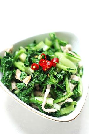 肉丝发白后倒入料酒 生抽以及小苔菜翻炒5分钟