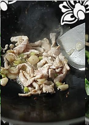 另外一个炒锅烧热倒入花生油 加入蒜片爆香 加入里脊肉丝翻炒至发白