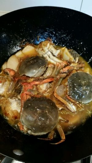 锅里的油不倒。开火后放入姜丝葱丝大火翻炒几下出香味。放年糕进去炒几下放蟹子翻炒。加适量黄酒。味极鲜和糖继续炒。因为有黄酒和味极鲜。不会太干。然后加小碗热水。我觉得没过年糕就可以。不然年糕会干。倒一丢丢耗油(太多会咸)然后放两三块冰糖。蟹子盖扣在上面改锅盖中小火炖7-8分钟。