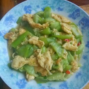 下油,油热后将切好的丝瓜倒入,不停翻炒
