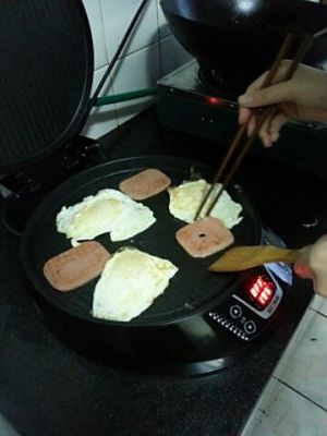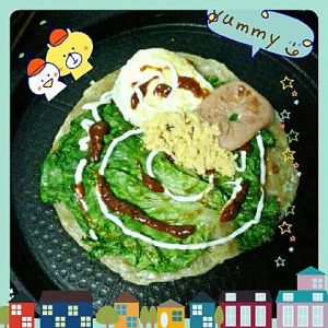 最后把煎好的鸡蛋 生菜叶 火腿放在饼上 依据个人喜好 放若干肉松 沙拉酱 或者蒜蓉酱 把饼卷好 大功告成!
