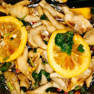 把凉好的鸡脚沥干水分,倒入调好的碗里,搅拌一下,放入柠檬片。