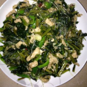 干菜心冷水发30分钟、绿豆粉丝冷水发30分钟洗净备用 猪瘦肉切丝放酱油淀粉,青辣椒切丝,大蒜切丝备用