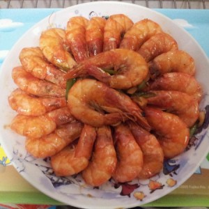 油锅热后放入大虾煸炒,煸透后烹入白酒,放入姜丝葱丝蒜片煸炒。