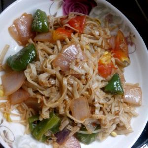 锅中放少量的油(可以将菜中多余的又来炒),将煮好的面条倒入锅中翻炒,快好时加入盐(我加了几滴醋),