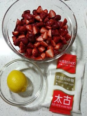 草莓用盐水腌半小时,洗干净切块,柠檬半个把汁挤出来装在器皿里备用。