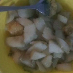 山药去皮洗净,用淡盐水(防止发黑,去黏)浸泡2分钟,扮上淀粉。