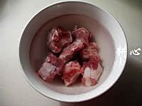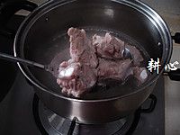 将去血水的肉排放入煮锅中,焯烫一遍,再次洗净。