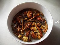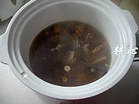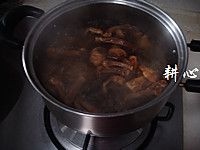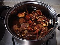 将全部食材放入煮锅中,连浸泡姬松茸的水也倒入锅中,并一次性加足适量的清水。