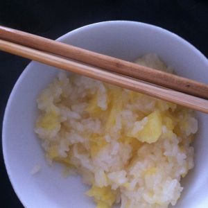 把中间掏出来,掏出来的菠萝和泡过糯米一起先蒸熟,把蒸熟的菠萝米饭放回空心菠萝回笼蒸5分钟,搞定